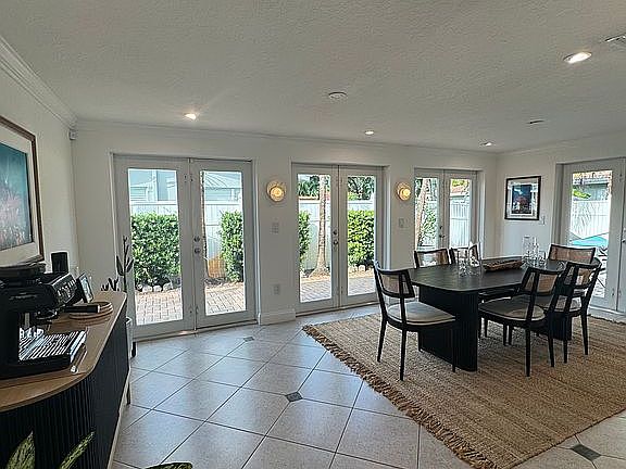 Step inside to bright, freshly painted interiors in Benjamin Moore’s “Chantilly Lace”, with tile flooring throughout. French glass doors, all impact hurricane windows and doors, recessed LED lighting, crown molding, and six-panel doors.