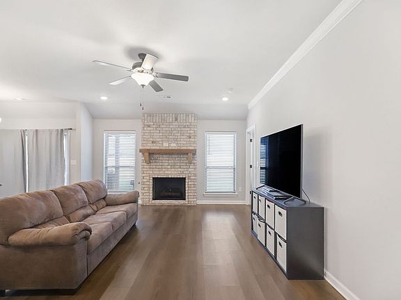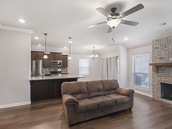 Discover modern comfort in the heart of Farmington at 281 West Tyler Road! This beautiful 2023-built, all-brick home features three bedrooms, two bathrooms, and premium finishes throughout. The open living space showcases a freestanding brick fireplace with gas logs, while the kitchen boasts 3cm granite countertops and stylish backsplash. The spacious primary bedroom offers added lighting, walk-in closet and primary bathroom with granite vanity. Highlights include tankless water heater, faux wood blinds that convey, gutters, and a two-car garage with 24' bay perfect for a smaller boat. The fully-fenced backyard features an extended concrete patio. Conveniently located less than 1 mile to Walmart Neighborhood Market and 2.4 miles to Creekside Park!
