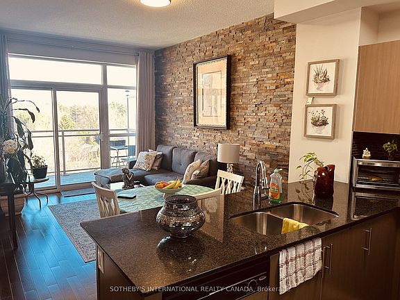 Spectacular one-bedroom suite in the heart of Market Lane, downtown Woodbridge. Featuring an open-concept layout with hardwood floors throughout, soaring nine-foot ceilings, and a beautiful kitchen with granite countertops, backsplash, and valence lighting. Walk out from the living room to a private terrace - perfect for relaxing or entertaining. Enjoy exceptional amenities including 24-hour security, guest suites, fitness centre, sauna, party room, and billiards room. Steps to boutique shops, restaurants, and cafes that make Market Lane one of Woodbridge's most desirable communities