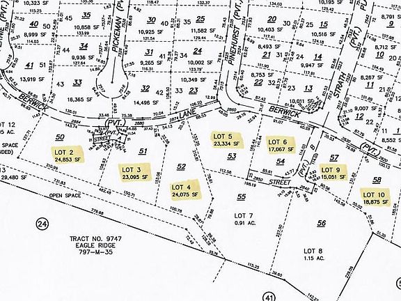 Spectacular setting in the gated community of Eagle Ridge Golf Club. Featuring 9 custom home lots ranging in size from 15,051 sq. ft. to 35,719 sq. ft. Prices range from $220,000 to 450,000. Many of the lots back to wooded open space. Lot 1 includes home drawings which have not been approved by the City of Gilroy or Eagle Ridge HOA. Eagle Ridge is a unique neighborhood offering activities for adults and children in addition to various social groups. Most activities are included in the low HOA dues. All lots are a short walk to community amenities including junior Olympic pool, tennis, pickleball and bocce courts, summer concert series at the large park with a playground, barbeque grills and sport court. All near the homeowner clubhouse. Golf leagues for women and men offered as well. There is something for everyone at Eagle Ridge. Enjoy the Eagle Ridge Lifestyle!