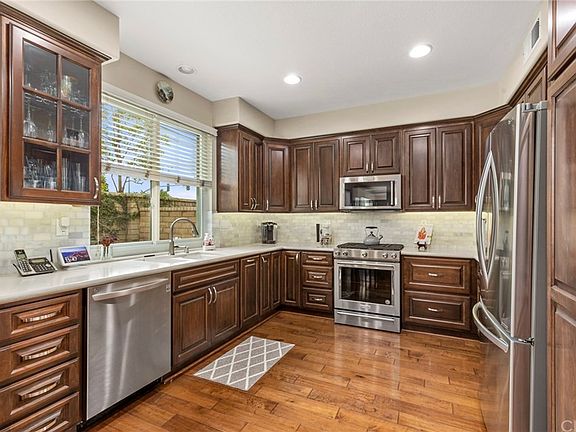 Rarely on the market! Lyon Mesa is an exclusive gated community of only 34 homes located in the heart of Costa Mesa. This truly turnkey home can't be missed. The living room offers an abundance of natural light complimented with cathedral ceilings and Hunter Douglas silhouette blinds. URBAN Lifestyle Handscraped wood floors are on the main level throughout. Enjoy family dinners in the formal dining room. The large family room features a custom built in entertainment center and cozy fireplace which opens to a rear patio for extended entertaining. The home has a beautifully upgraded Chef's kitchen with beveled quartz countertops, decorative marble backsplash, custom self-close cabinets and drawers, stainless appliances including a KitchenAid convection oven and microwave, large pantry with pull out shelves and a breakfast nook. The second level offers four large bedrooms plus a bonus room, brand new carpet, convenient upstairs laundry, and the spacious master bedroom suite with vaulted ceilings. Relax in your master bathroom spa tub. Additional features include dual pane windows, smooth ceilings, plantation shutters, recessed lighting, newer air conditioner, newer forced air unit and whole house water filtration system. An entertainer's dream, easily capable of hosting family gatherings and events. Close to shopping, freeway access and wonderful local beaches. Take advantage now!