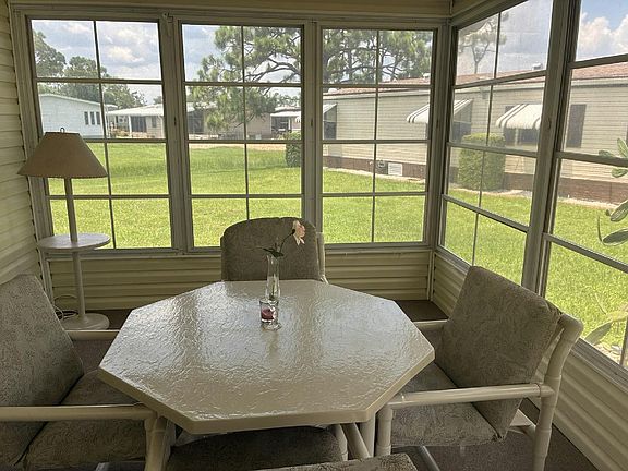 You will enjoy this cozy 1994 Barrington 2 bed/2 bath home on a quiet pie-shaped lot with a charming front kitchen overlooking the street. Just minutes from the clubhouse, pools, and courts. Includes a single-car garage and is partially furnished. While some updates could enhance it, the home is solid and well cared for-a great opportunity to make it your own!