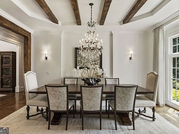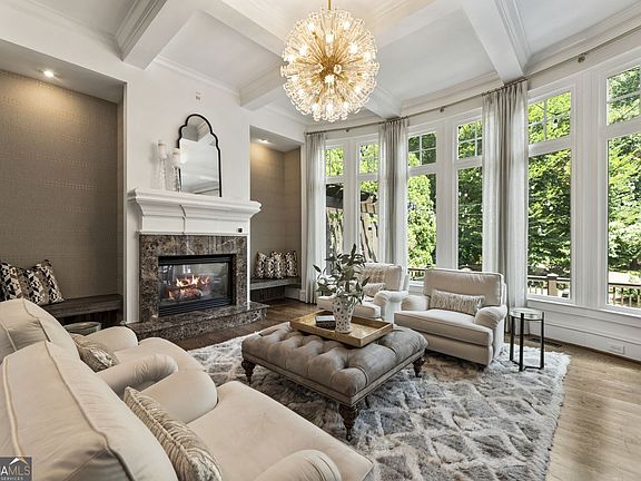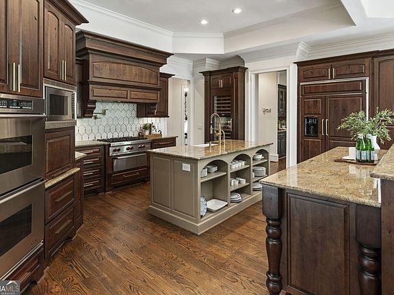 Welcome to this exquisite estate located in this sought after gated community in Milton where classic craftsmanship blends seamlessly with modern luxury. From the moment you arrive at the property, you are captured by the outside of the home and the custom stone and brick facade with all of the lush landscaping that sets the tone for a home designed to impress and built to endure. Step inside to a soaring foyer featuring a sweeping staircase and custom wrought iron railing that opens to the gorgeous dining room and main level. Multiple living areas offer warmth and versatility, showcasing coffered or beamed ceilings, architectural accents, stone fireplaces, and walls of windows that flood the rooms with natural light. Whether hosting guests or enjoying quiet evenings at home, these spaces embody comfort and sophistication. The gourmet kitchen overlooks the warm and welcoming keeping room with stone fireplace features rich custom cabinetry, professional-grade appliances, and expansive granite counters with double islands perfect for entertaining. This seamless blend of elegance and function is designed for culinary excellence and everyday living. Formal and casual dining spaces each provide their charm-from a chandelier-lit dining room with dramatic wood beams to a sunlit breakfast nook overlooking the gardens, outdoor decking, screened porch, covered patio and pool area. A richly paneled study with custom built-ins and a bay window creates a refined setting for work, reading, or reflection. A beautifully appointed main level guest bedroom and bath offers comfort and convenience, while two main level powder rooms feature designer finishes and modern fixtures, ensuring style and function. Upstairs, the primary suite is a true sanctuary including a spacious layout with a sitting area and fireplace, spa-inspired bath, and generous dual walk-in closets. Three secondary bedrooms include ample closet space and easy access to well-appointed baths, providing comfort for family and guests alike. A large recreation room anchors the upstairs, offering endless possibilities as a media lounge, playroom, or casual gathering space. Step outside to your private oasis. A sparkling pool with a cascading waterfall, lush landscaping, and an inviting fire pit and hot tub area provide the perfect backdrop for relaxation or entertaining. Multiple outdoor living areas, including a spacious deck and covered screened-in porch, make indoor-outdoor living effortless. The home's unfinished basement, with a generous footprint, presents an incredible opportunity to customize and create the ultimate extension of your living space while offering wonderful storage space. Throughout the home, thoughtful details-hardwood floors, designer lighting, and impeccable craftsmanship-add depth and character. Every corner of this residence reflects timeless design and modern ease. The gated community ensures privacy, security, and a true sense of retreat, while being just minutes from top-rated schools, shopping, dining, and the heart of Milton. This is more than a home; it's a lifestyle. Don't miss the opportunity to own one of Milton's most exceptional properties in The Manor.