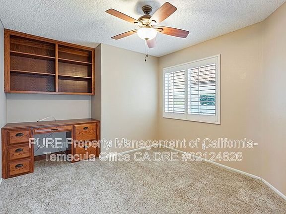 55+Community Welcome to this charming single-story home in the 55+ community of Menifee, CA. This cozy residence features 2 bedrooms, 2 bathrooms, a den/office, and a spacious family room with a fireplace. The kitchen is equipped with a dishwasher and a built-in computer desk. Enjoy the convenience of a laundry room, his & her sinks in the master bathroom, and ceiling fans throughout the house. The property boasts carpet and tile flooring, as well as a patio cover for outdoor relaxation. Step outside to a large private backyard perfect for entertaining or simply enjoying the sunshine. Residents also have access to the community swimming pool for leisurely swims on warm days. Don't miss out on this fantastic opportunity to make this house your new home! Listing and marketing information provided is deemed reliable and accurate but not guaranteed - agent, broker, and resident should confirm all property information and specifications before entering rental agreement. Visit our website to review our rental criteria prior to submitting an application. A $54 non-refundable application fee per adult will be charged. Every person over 18 who would reside at the property must complete and submit a rental application. We are a fair housing provider. All applicants will be subject to the same application criteria. For REDUCED move-in costs, talk to us about our Security Deposit Replacement Program! Enjoy the benefits of the Resident Benefits Package (RBP), tailored to your needs. Choose from our tiered pricing options, starting at just $25.99*/month. Your RBP may include: Liability insurance HVAC air filter delivery (for applicable properties) On-demand pest control And more! Contact us today to learn more about the RBP tiers and find the perfect fit for you. *We do not accept applications from any 3rd party service including Zillow. Please apply on our website directly. PURE Property Management of California DRE #02124826 Amenities: dishwasher, fireplace, den/office, carpet, family room, his & her sinks, laundry room, tile, patio cover, wood flooring, community swimming pool, ceiling fans, large private backyard, built-in computer desk