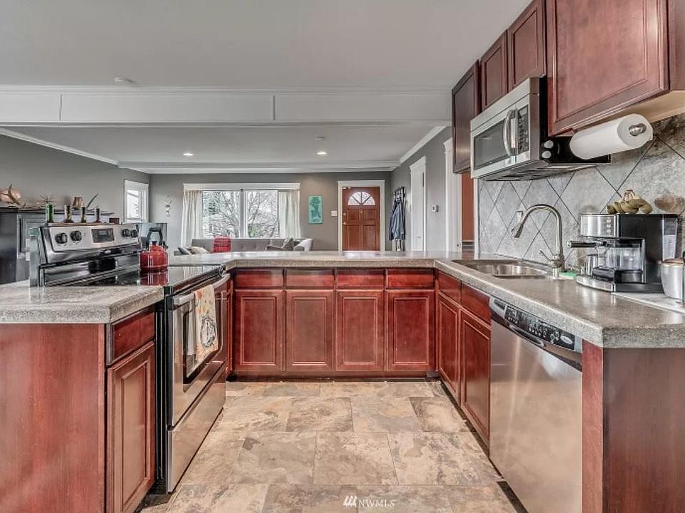 Drive home down this beautiful tree lined street full of Cherry Blossoms. A bright open concept home with great character. This classic 2 bed, 1 bath home will surprise you with all the extra space it has to offer. Views of the Cascade mountains from the kitchen and dining area. Beautiful concrete kitchen counters & stainless steel appliances. Large well-lit finished basement with built-in shelves, plenty of room for office, rec room and extra guest area. Large laundry room, extra cabinets & sink. Mature Cherry tree in front yard. Backyard offers a large courtyard & deck with abundant space for entertaining next to elegant Italian cypress pine for privacy. Gated driveway with alley access fits 3+ cars. Detached garage structure(480 sq ft) Tenant will pay water, sewer, garbage and electricity. Tenant Liability insurance for house protection is not required. This property is listed for voucher housing only.