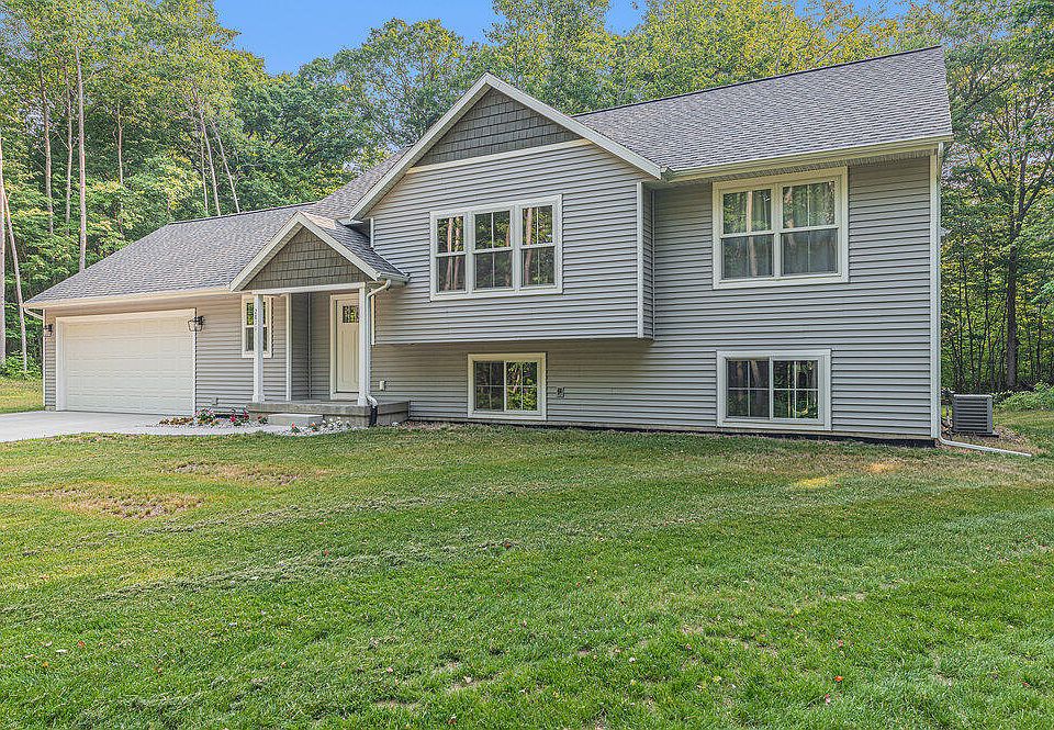 Good as new! This spacious bi-level built in 2021 has over 1235 sq ft of living space! The large foyer area invites you in offering a mudroom with boot bench and half bath with main floor laundry. The kitchen has soft close cabinets, a large center island, pantry, and GE appliances. This expanded floor plan allows for larger bedrooms and a larger open concept kitchen/dining/living room area with cathedral ceilings. The main floor full bath also has dual sinks. The lower-level walkout is plumbed for a second bathroom giving you options for adding additional bedrooms and living space. One lower-level bedroom has also already been framed and drywalled. This home is tucked back on 2.28 acres and has a huge garage (22 X 25) which is great for larger vehicles, toys, & storage. Tour today!