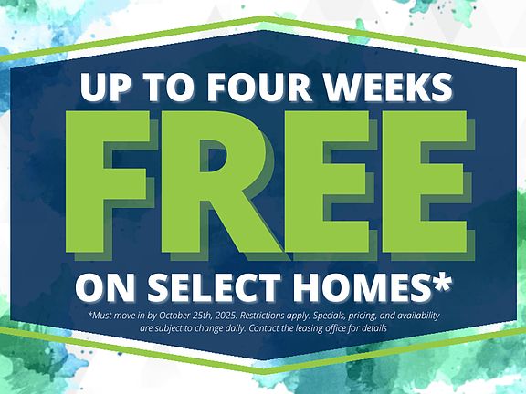 - Special offer! Up to Four Weeks Free on select homes! *Must move in by October 25th, 2025. Restrictions apply. Specials, pricing, and availability are subject to change daily. Contact the leasing office for details
