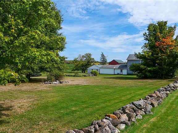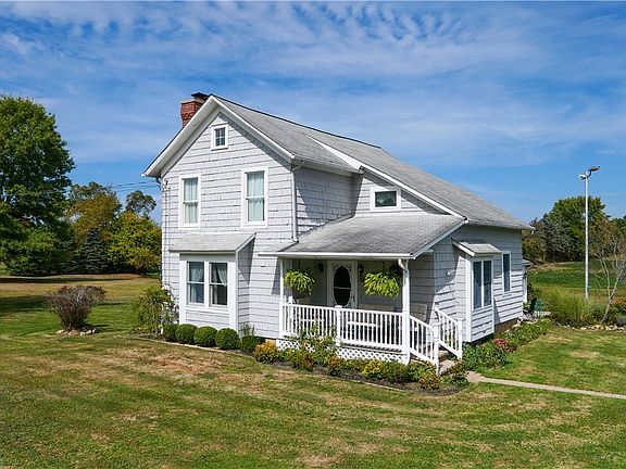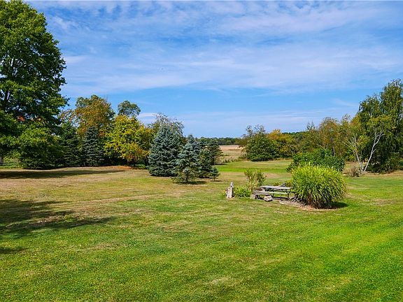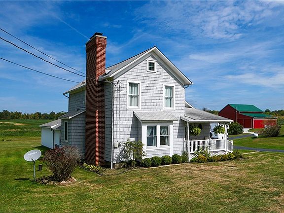 Nestled on a peaceful street surrounded by picturesque farmland, this charming cedar sided farmhouse offers a perfect blend of modern amenities and rustic beauty. The inviting front porch made of composite decking is ideal for relaxing, while the brick paver patio area and stone fire pit make outdoor entertaining a delight. Enjoy the 3 car outbuilding for all your outdoor toys! The large breezeway seamlessly connects the attached garage to the home, offering easy access. The updated kitchen features Corian countertops, a stylish metal backsplash, and a large island with seating, perfect for family gatherings. The living room boasts a cozy wood-burning fireplace flanked by built-in bookcases, along with a charming window nook for reading or enjoying the view. Additional highlights include first-floor laundry, a spacious downstairs bathroom, and a beautiful layout that combines comfort and functionality. The wide staircase leads to three spacious bedrooms, including a master with stunning views of the yard, and a full bath with a convenient laundry chute. This serene home offers a perfect retreat with modern upgrades, surrounded by nature's beauty.