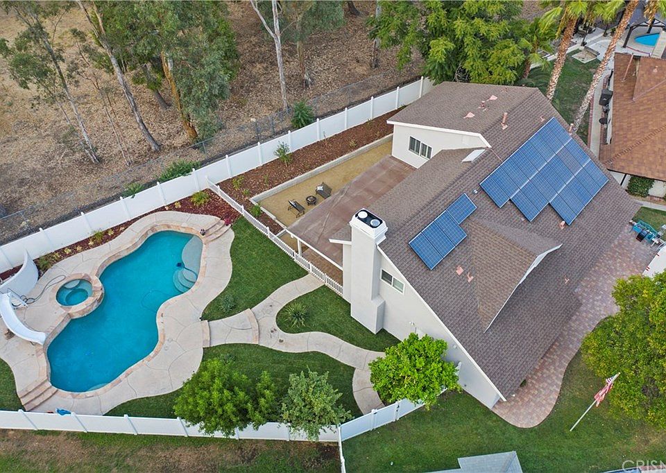 This newly remodeled home is on the end of a cul de sac lot with an enormous yard surrounded by 6 ft vinyl fencing. The side yard has an in-ground 40 by 17 ft freeform pool with a slide and a spa, while the backyard has a trellised garden above entertaining covered and open-air patio. The downstairs has a mini-suite with separate access to the outside and pool. The living room, dining room, and kitchen are open to each other. The living room has a custom granite and ebony-stained oak fireplace. Beautiful! The upstairs bedrooms all have new carpet, and all other flooring is 5-star laminate or travertine tile.