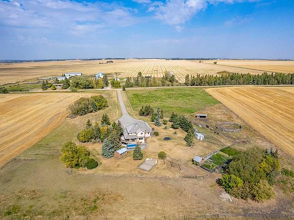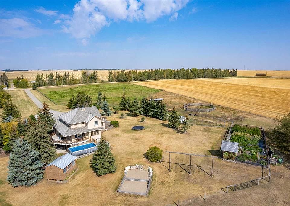 Welcome to this beautiful acreage just 18 minutes east of Olds. Built in 1987, this 2,537 sq.ft. two-storey home (plus fully developed basement) offers 5 bedrooms, 3.5 bathrooms, and over 4,100 sq.ft. of total living space and 8.08 acres of land. Step into the spacious foyer, where a sweeping curved oak staircase sets the tone. To your right, a cozy seating area with a built-in coffee bar invites gathering, while to the left, the dining room flows naturally into the large kitchen with a breakfast nook. The living room features a fireplace and tall ceilings, creating a warm yet airy atmosphere. Upstairs, the primary suite is a true retreat with a large walk-in closet and a 4-piece ensuite. Two more bedrooms, a full bath, and a loft complete the upper level. The finished basement provides 3 additional bedrooms, a rec room, a full second kitchen, and walk-out access to the yard—perfect for extended family or guests. The owners have blended modern conveniences with character-rich details, including dark-stained oak trim, wide baseboards, vintage-style grates, and quality hardware. Outside, the property is as remarkable as the home itself. Professionally landscaped, it features two slate-stone patios—one nestled in the trees with a fire pit for quiet getaways, and another on the east side of the garage. A stone platform supports an above-ground pool, while tamarack posts and natural logs create an authentic acreage feel. You’ll find an enclosed garden, chicken run, and a custom-built swing set with a sand pit. A screened outdoor shed with a wood stove offers a unique space for gatherings or a rustic outdoor kitchen. And, for the horse lovers, there is also a pasture and a round pen. Located on pavement with only ¼ mile of gravel, the property offers privacy with just one neighbour across the road and no through traffic. With its mix of modern functionality, timeless character, and stunning outdoor spaces, this acreage is a rare find.