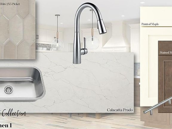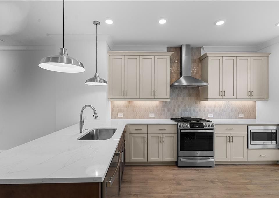 Modern stylish finishesL-shaped islandCozy stacked quartzite fireplaceLarge walk-in closetTile backsplashQuartz countertopsLight cream cabinetry