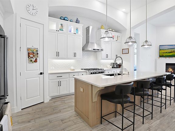 Step inside through elegant double front doors into an open, light-filled floor plan featuring wood-look tile throughout. The chef’s kitchen boasts a gas professional-style cooktop and hood, double built-in ovens, quartz countertops, extended upper cabinets with glass inserts and puck lighting, under-cabinet lighting, and soft-close drawers and doors. The open-concept living area includes a gas fireplace and large slider patio door for seamless indoor&outdoor entertaining.