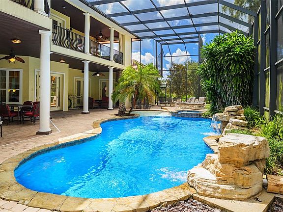 Custom-built luxury home designed for today’s vacation rental market—just 3 miles from Walt Disney World! This turnkey, fully furnished property includes transferable future bookings and a proven rental history, making it one of the top-performing homes in the resort area. Offering 8 bedrooms—7 of them en-suites—this impressive residence of over 6,000 sq. ft. blends elegance, comfort, and high-end design. The circular drive, tropical landscaping, and manicured lawn create standout curb appeal. Step through double doors into a grand two-story foyer with a private office to one side and formal dining to the other. The formal living room features a gas fireplace, designer furnishings, and French doors framing views of the custom saltwater pool with rock waterfalls, a brand-new heating system, and natural conservation beyond the screened lanai. Enjoy the tranquil setting of Moon Lake, where you can relax and watch a variety of Florida wildlife and waterfowl. The open family room connects to a sunny breakfast nook and a gourmet kitchen with granite countertops, wood cabinetry, premium appliances, and two wine coolers. A theater-style media room with surround sound completes the entertainment spaces on the main floor. The first-floor primary suite spans nearly 60 feet in length and includes a spacious dressing room and spa-style bath with luxurious details. French doors open to a private lanai with gas fireplace, leading to the pool and spa with beach entry. The outdoor living area includes covered and open seating, an outdoor kitchen, and a soaring two-story screened enclosure for year-round enjoyment. Upstairs, a curved staircase leads to a loft-style game room and covered porches furnished for relaxation and sunset views over Moon Lake. Four additional ensuite bedrooms share a large second-floor balcony overlooking the pool and conservation area. Set on over half an acre, this property includes a sun deck, large outdoor chess set, lush lawn areas, and abundant gathering space—ideal for extended families, reunions, corporate retreats, or intimate celebrations. The laundry room is equipped with two washers and two dryers, providing excellent capacity for rental turnover or large groups. Located less than a mile from local attractions such as a nearby winery, the water park, and entertainment at Margaritaville, this home also offers quick access to Orlando’s theme parks, convention centers, dining, shopping, sports venues, and beaches on both coasts. After a day of adventure, return to serene luxury in this fully furnished resort-style home.