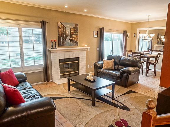 Beautiful Brock Canyon Villas townhouse featuring 3 bedrooms and 2.5 bathrooms. The open concept dining room, looks out into the living room. Home features crown moulding, plantation shutters, a fireplace in the living room, and a breakfast bar in the kitchen. The large master bedroom has a vaulted ceiling, a built in mirror, a walk in closet, as well as a private master bathroom. There are two other bedrooms upstairs and a bathroom vanity with dual sinks. This townhouse is an end unit, and has one of the largest back yards in the complex! The home has newer paint, carpet and stove. All of the fixtures in the kitchen and bathrooms have been replaced with new low flow energy efficient fixtures within the last year, as well as a new water heater and garage door. This well manicured complex features a community pool and spa, and is conveniently located near schools and shopping.