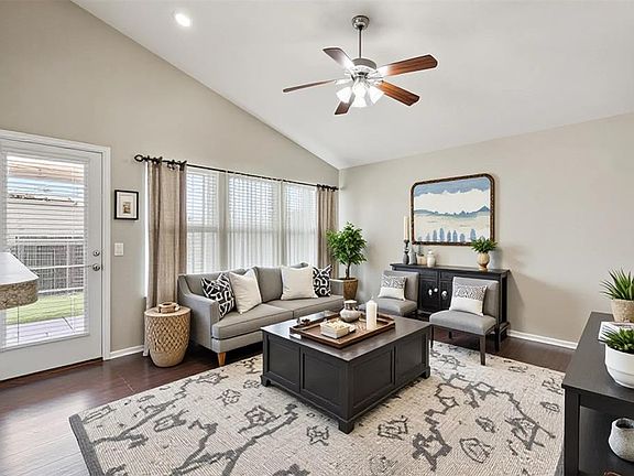 This beautiful open concept home is perfect for entertaining! This one is ready for its new owner, move-in ready, an open living area with vaulted ceilings, lots of natural light, wood floor, back door with screen to pull to allow some fresh air in on those nice evenings. An extra paved outdoor patio is ready for a fire pit and chairs as the cool weather return. The kitchen has been re-done with newer appliances, stove/2021, above stove microwave/2021, dishwasher/2024, refrigerator/2023, Garbage Disposal/2021, Hotwater Tank/2023, New Paint, New Formica Counter Tops, Washer and Dryer/2023, New Farm Sink and Tile Back Splash and has a convenient pantry. Master Bath completely re-done in May/2022. This home has Fresh Paint, New Roof/2019, Guttering, Garage Door, New Carpet and Storm Shelter in Garage Floor. It will be hard to find something that this one needs because it is just immaculate!! Relax on the north-facing covered patio! All this and Deer Creek Schools!!