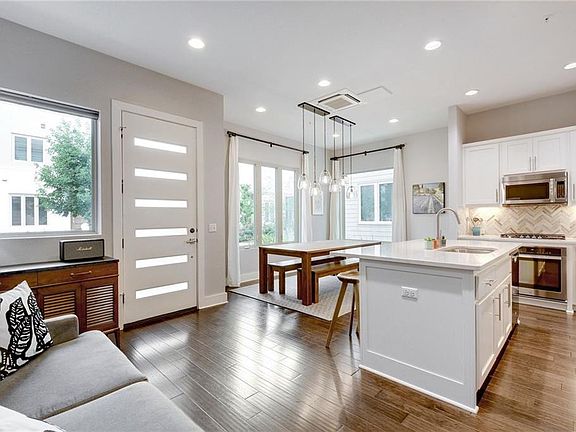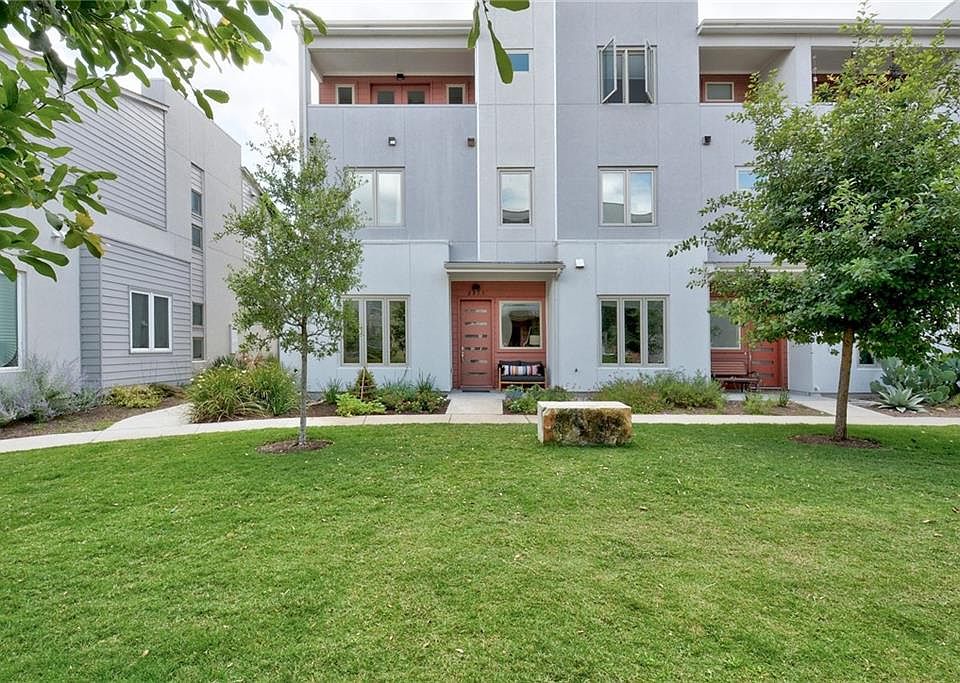 Phenomenal opportunity to live on a coveted courtyard in Mueller next to a park and pool! This spacious, sun-filled home features three large bedrooms with walk-in closets and private bathrooms. Entertain in a well-appointed kitchen with flexible dining and living spaces. Relax in the generous family room with wet bar and built-ins featuring handmade tile and reclaimed wood. Enjoy panoramic views from the third floor balcony! 2 car garage. Ready for EV charging and Google Fiber. SEE 3D TOUR!