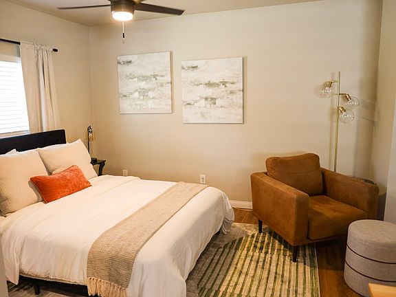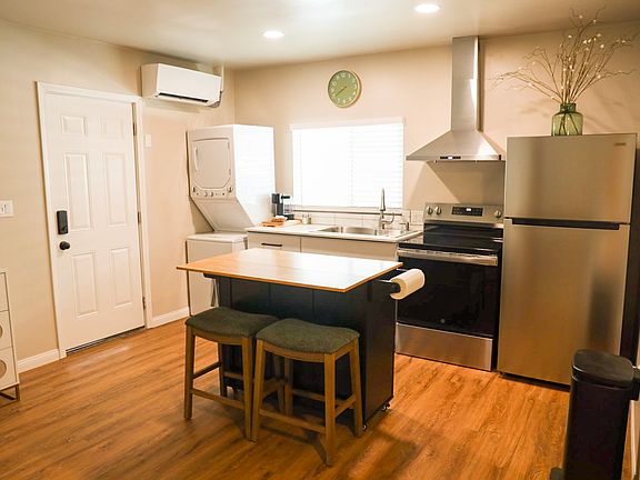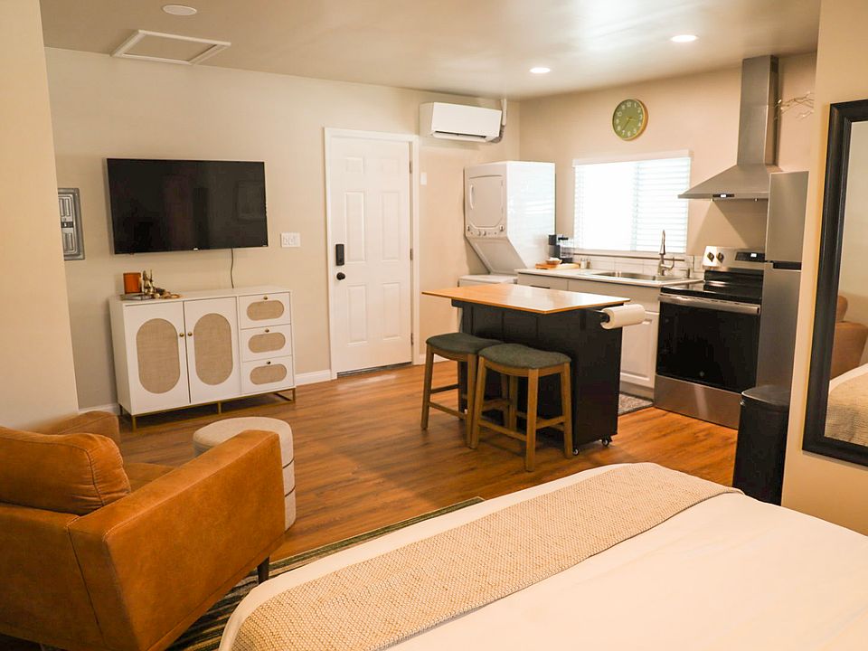 This brand-new studio apartment has everything you need; a full kitchen, in-unit W/D, heat & A/C, blackout curtains, walk-in shower, 50-inch smart TV, and high-speed Wi-Fi.