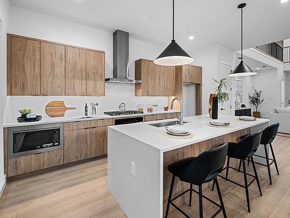 Sleek modern appliancesChic electric fireplaceTall privacy fenceOversized windowsLuxury finishesModern luxuryOpen-concept floor plan