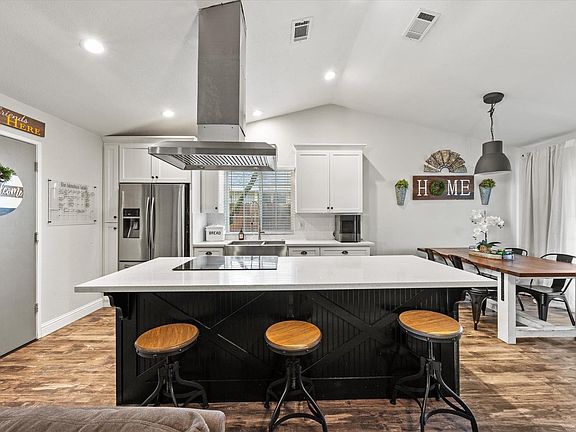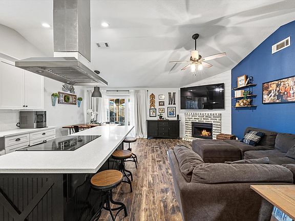 Cozy wood burning fireplaceInviting open concept layoutModern comfortNew vinyl flooringRemodeled kitchenVaulted ceilings
