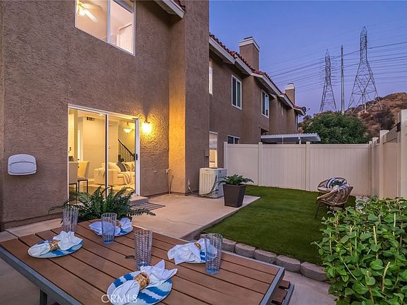 Discover this stunning townhome nestled in the heart of Saugus in the Brock Villas, offering three spacious bedrooms, three updated bathrooms, and nearly 1,400 square feet of open, comfortable living space. As you step inside, you are greeted by soaring cathedral ceilings, elegant wood flooring, a custom-designed bannister, tasteful paint selections, and stylish designer light fixtures. The inviting family room, featuring a cozy slate fireplace, opens to the expansive backyard through glass doors, providing ample space for entertaining.The kitchen has been beautifully upgraded with newly painted cabinetry and newer appliances. The remodeled powder room boasts charming wainscoting, a classic pedestal sink, and premium fixtures. Upstairs, the expansive primary suite impresses with its high ceilings, a generous walk-in closet, and picturesque views of the surrounding landscape. Both the ensuite and hall bathrooms have been tastefully updated with modern shower enclosures, refinished vanities, and upgraded lighting. The additional bedrooms are generously sized, each offering abundant closet space. Step outside to enjoy the thoughtfully renovated backyard, featuring new artificial turf, multiple patio areas, and a spacious side yard—ideal for hosting gatherings or savoring serene Santa Clarita evenings. The property also includes an attached two-car garage with built-in storage and laundry facilities. Conveniently located near award-winning schools, shopping, scenic parks, and with easy access to major freeways, this home combines comfort and convenience. Community HOA amenities include a pool, spa, playground, ample guest parking, and well-maintained common areas.