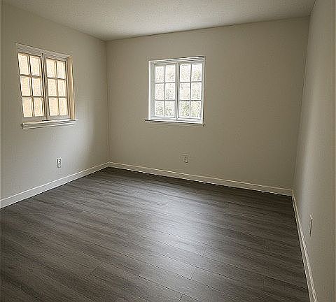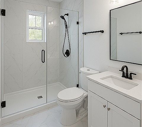 The home offers comfortable bedrooms, all updated with neutral tones and plenty of natural light. The main bathroom is a true highlight — fully renovated with large-format porcelain tile, a glass shower, black fixtures, and a spa-inspired finish.