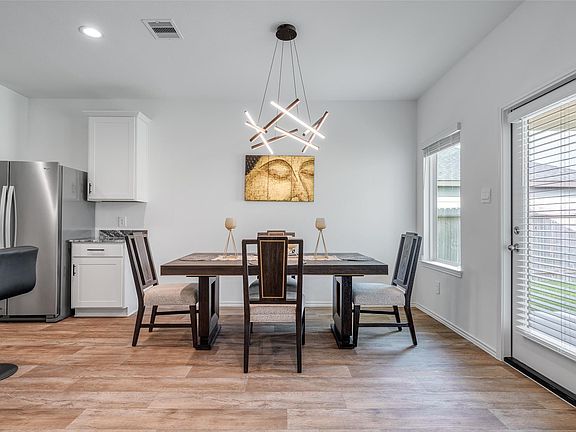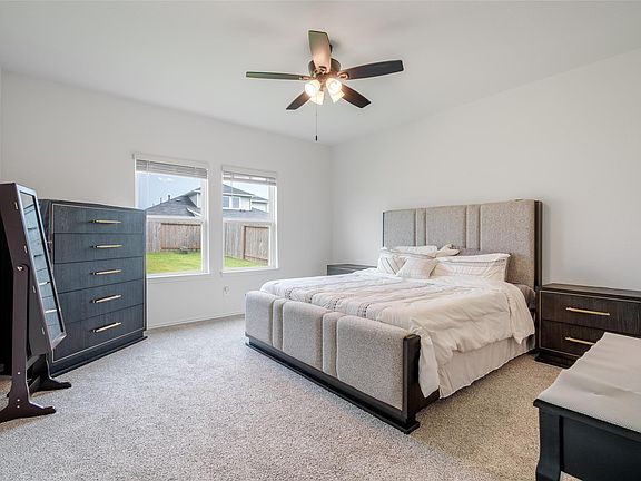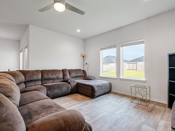 Welcome to this inviting 4-bedroom, 3-bathroom home with an attached 2-car garage, offering comfort and functionality throughout. The bright kitchen boasts sleek white cabinets, a spacious island, and a cozy breakfast nook just steps away—perfect for casual dining. The living room features windows with privacy blinds, recessed lighting, and a ceiling fan, creating a warm and welcoming atmosphere. Upstairs, enjoy a versatile game room ideal for entertainment or relaxation, while the primary bedroom ensuite is conveniently located downstairs for added privacy. Outside, the fenced backyard provides plenty of space for play or gatherings, complete with a covered patio for shaded enjoyment. This home also comes packed with premium features, including a whole-home water softener system, an epoxy-coated garage floor for durability and easy maintenance, soft-close cabinets throughout, and ceiling fans in every room for year-round comfort.