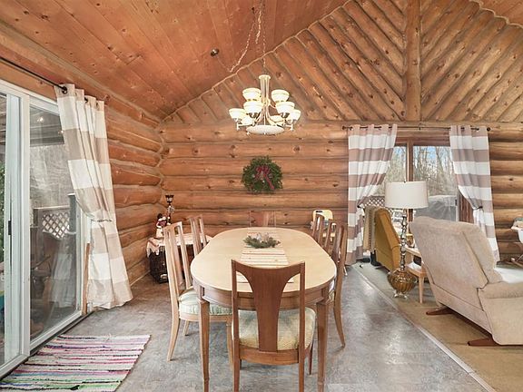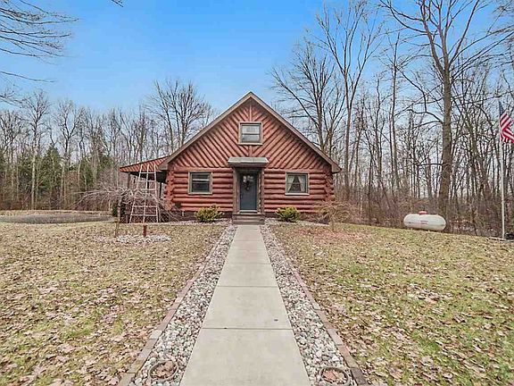 This picturesque log cabin is nestled on 5 acres beside a stocked pond and a creek that breaks off of the Kawkawlin River. Groomed trails take you through the majority of the property, perfect for the wildlife enthusiast. The 2 1/2 car garage is equipped with its own 220 wiring and panel and connect to both a small metal shed and a very large lean-to meant for either lawn equipment or livestock. Follow the classic wrap around porch inside to find vaulted ceilings and an open floor plan. This house boasts 3 bedrooms and 2 full baths, one of which has a gorgeous clawfoot tub and heated tile floors. The second bath, located upstairs in the master suite, has a larger-than-life feel with its tiled shower and skylight window to flood the room with natural light. The main floor is a gorgeous mix of organic and mid-century modern styles with a retro stairwell fitting for a gallery wall. A vintage, colorful kitchen brings charm to the first floor and 2 bedrooms finish off this cozy cabin.