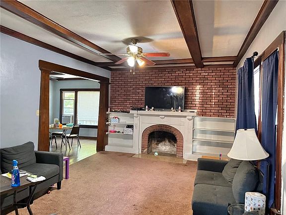 Dining roomEating area in kitchenBeamed ceiling with fireplaceBonus roomStorage building