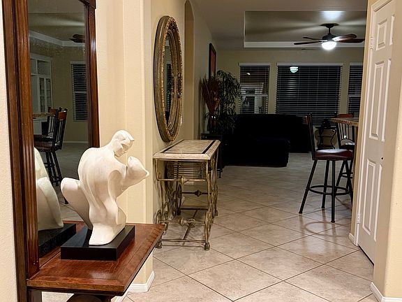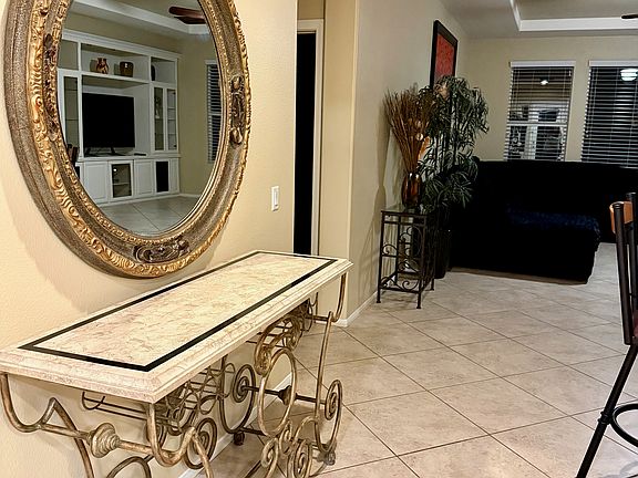 View homeTwo car garageRock waterfall fountainTennis and pickleball courtsRaised plantersBuilt-in entertainment centerValley and mountains