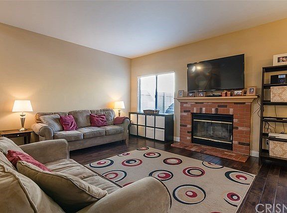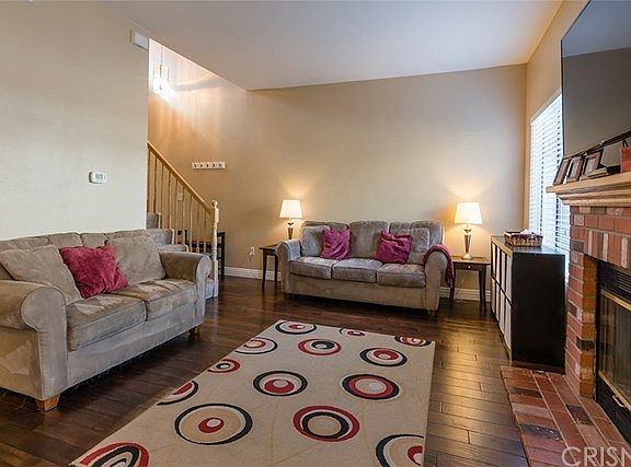 Presenting a pristine 3 bedroom 3 bath Brock Canyon Villa. Features include beautiful wood floors on the lower level, a large living room with brick-covered fireplace, a dining area, and a large kitchen with a breakfast bar, stainless steel appliances, tile counters and direct access to the two-car garage (enough parking for 4 cars between driveway and garage). The plushly carpeted upstairs features a large master bedroom with master bath and large walk-in closet, two more bedrooms and a hall bath. Other features include decorator paint colors throughout, a newer vinyl fence and extra garage storage. This unit has one of the longest driveways and largest back yards in the tract. Set away from the main streets, with partial views of the nearby canyons. HOA amenities include pool, spa, grassy area, close to Caraway park. No Mello Roos!