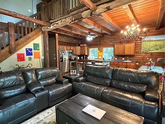 Nestled in the heart of "The Wilderness" of Excello, MO, this 3 BR, 2 Bath log home offers rustic charm with modern comforts. Inside you'll find spacious rooms, a kitchen equipped with sleek stainless appliances, and a stunning loft that overlooks the expansive living room. The center piece of the home is the grand fireplace, creating a warm and inviting atmosphere perfect for relaxing after a long day. This retreat combines natural beauty with cozy living, making it an ideal escape. Access to 100 acres of trails, pits and nature.