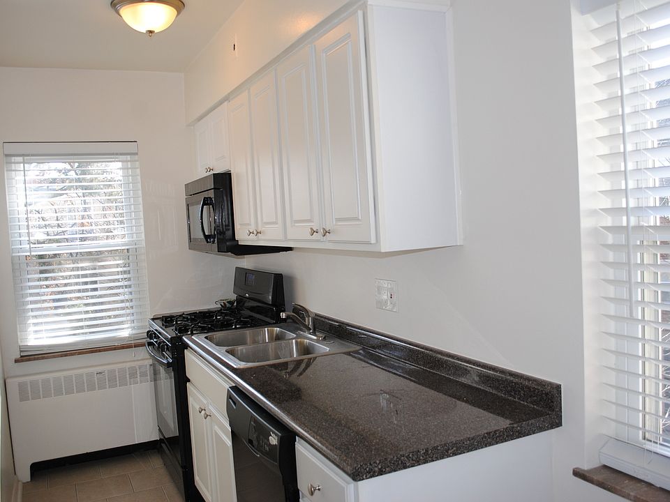 Gorgeous, renovated one bedroom apartment. Eat in kitchen comes equipped with all appliances (gas stove, refrigerator, dishwasher, microwave), new white cabinets, faux granite counter tops, and new ceramic tile floor. Bathroom features built in storage in addition to vanity and medicine cabinet storage. Hardwood floors in living room and bedroom. Closet in living room, bedroom and pantry off of kitchen. New high efficiency A/C units provided. Updated windows throughout apartment, and all have security locks.