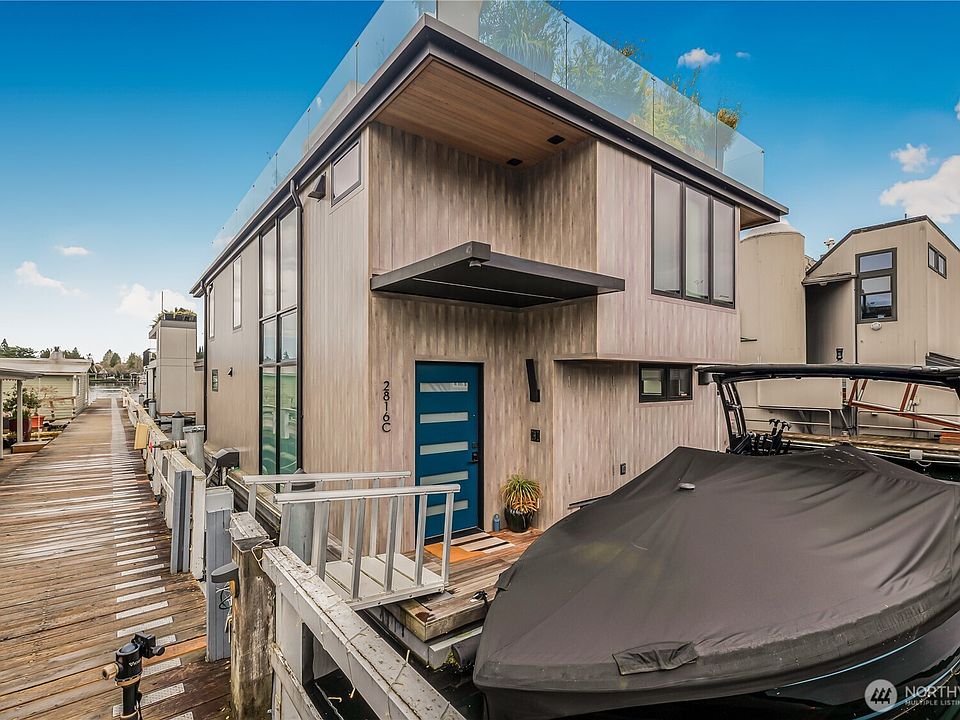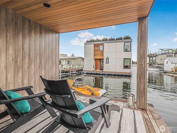 Second from the end! Newer floating home w/ easy boat moorage, dedicated garage parking w/ electric! Walls of floor to ceiling glass windows to take in large views. Sleek kitchen w/ SubZero fridge, Wolf gas range & Dekton countertops. Large bright living & dining room spaces w/ beautiful linear fireplace & warm wooden floors. Nana wall opens to covered deck or head up to the expansive private rooftop deck w/ plumbed fire pit.On the lake level you will find the bedrooms to peacefully rest to the sounds of lapping water. Breezeway deck between en suite main floor bedrooms + third bedroom/office on upper level. Rare basement has large flexible space, office nook, bonus room w/ utility & storage space. Radiant floors throughout.Built in Sonos.