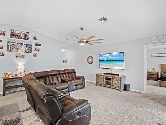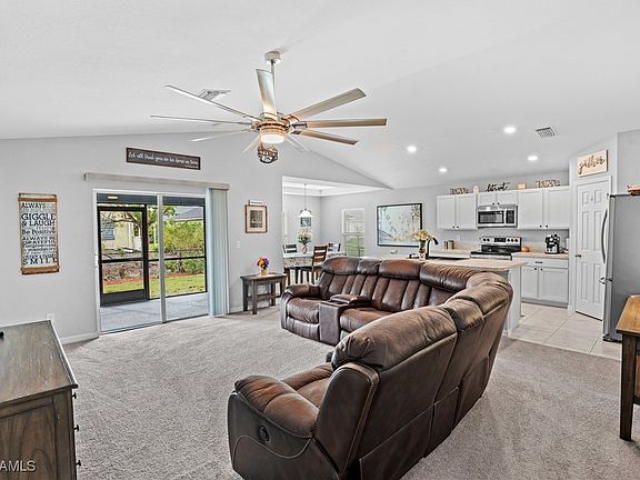 Welcome to your newer construction home located in what is becoming the “New” area of Cape Coral. A quick 8 minute drive lands you at Seven Islands—future location of waterfront living, vacationing (Marriott Hotel & Resort), waterfront dining, shopping, and amenities such as a Community Center, Splash Pad, Kayak Launch, Outdoor amphitheater, dog park, and much more! Featuring 4 bedrooms and 2 bathrooms, this spacious floorplan allows privacy for both owners and guests. The primary bedroom, located at the rear of the home, features an ensuite with dual sinks, walk-in closet, and linen closet. The light and bright kitchen opens to the living room and boasts an island with bar seating and stainless steel appliances. Dining is just off the kitchen, showcasing a decorative tray ceiling. Your screened lanai will enable you to enjoy outdoor living rain or shine, plus the fully-fenced yard offers peace of mind for kids and fur-babies. Don't miss your chance to live the Florida dream and schedule your private tour today!
