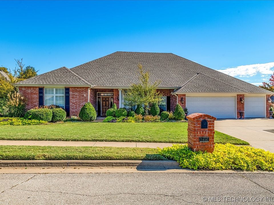 Beautifully maintained full brick, one-level home offering 4 bedrooms, 3 baths, and a spacious 3-car garage! Step inside the large entryway and discover an inviting layout featuring new carpet in the living, dining, and hallway areas, along with fresh interior paint throughout. The kitchen boasts granite countertops, a built-in microwave, stove, gas cooktop, and dishwasher (all new in 2019), plus a flexible area off the kitchen perfect for an office or hobby space. The primary suite includes a remodeled shower (2018), a relaxing whirlpool tub, and plenty of natural light. Additional highlights include vinyl windows, a utility room with sink and space for a freezer, and floored attic storage. Enjoy outdoor living on the covered patio overlooking a beautifully landscaped, fully fenced backyard with a sprinkler system. Professionally landscaped front yard and a new roof in 2024 make this home move-in ready and worry-free!