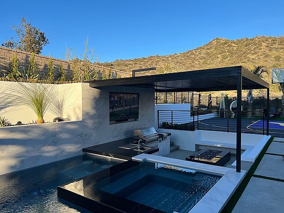 Nestled in Valencia West Hills-Monument's striking gated neighborhood lies an unbelievably luxurious home. Stroll into this property fit with 6 beds & 4 ½ baths. Two living rooms, bedroom, bathroom, full kitchen, washer/dryer and walk-in closet. An open floor plan generates a spacious ambiance, complete with a dining room embossed with high ceilings and built-in cabinetry. Rich wood flooring throughout encase this inviting space. The family/living room is guaranteed to amplify any guest's visit to this superb home. This space acts as powerhouse with an entertainers backyard thst spared no expense, featuring a modern design with pool, sunken fireplace, elevated outdoor dining, basketball court and massive putting green. Its master suite boasts a custom walk-in closet, balcony, and luxurious bathroom, complete with a soak in tub & separate shower. Lounge by the upgraded fireplace or work out in the home's private gym. This high-end property is undoubtedly captivating, has been renovated and updated with modern finishing, ensuring to keep up with one's intriguing lifestyle!
