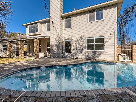 Charming home with a pool on a cul-de-sac in Shady Hollow! In addition to the main living area with a fireplace, there are 2 additional loft spaces/game rooms upstairs. 1 bedroom and full bath located on the main level perfect for guests or multigenerational families. The primary bedroom is on the 2nd level. Tall ceilings throughout. Large kitchen with stainless steel appliances, island and walk-in pantry. Relax by pool in a private, fenced yard with a covered patio and extra storage in the shed. 2 car garage, sprinkler system and upgrades throughout the home.
