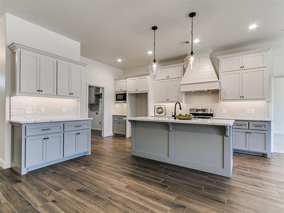 Spacious front sitting porchOpen floor planCurb appealWood-look floorsWell-appointed kitchenTwo tones painted cabinetsFull gutters