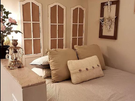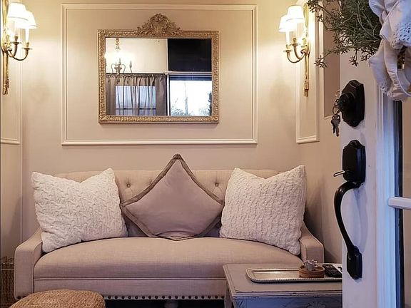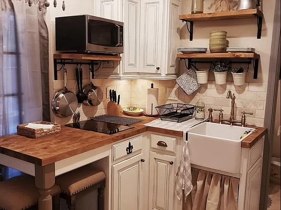Queen bedFull kitchenFenced yardAntique sofaGold sconce lightsFarm sinkOff-street parking