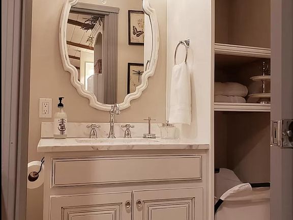1 bedroom, 1 bath, full kitchen with farm sink, refrigerator, freezer, cooktop, oven and coffee maker. Seating area with chandelier. Living area with HDTV, antique sofa and end table, plus antique gold sconce lights and mirror. Bedroom has queen bed, gold sconce lighting, end table and wardrobe.