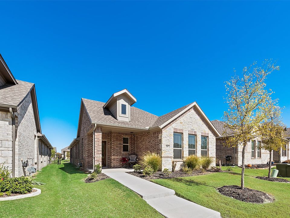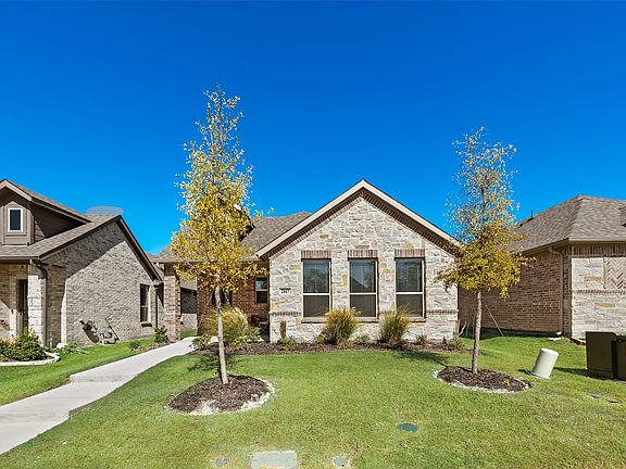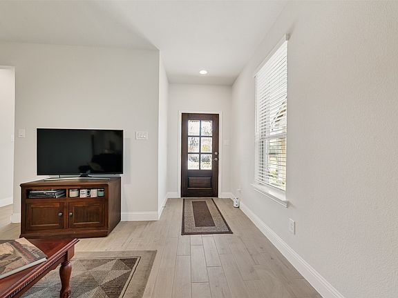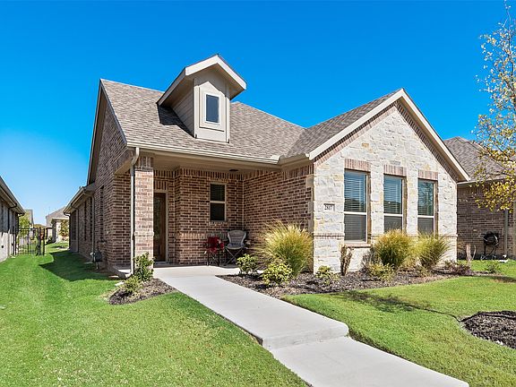 Over 55 gated community with pool and pickleball court. Lovely, landscaped drive- up appeal. Covered front porch. Stained front door with glass panes. Walk into a spacious and open floorplan. Living area, breakfast and kitchen are all open to one another. Gorgeous kitchen with quartz countertops and subway backsplash tile. Numerous cabinets that offer lots of storage! Gas 4 burner cooktop. One level island with bar top and sink built in. Double door pantry. Drawer for trashcan. Stainless appliances. Refrigerator, Washer and Dryer to convey with property. The impressive flooring throughout the main areas of the home are a light ceramic wood- look tile. Flex room could be used as office, sunroom or 2nd TV area. Split bedroom floorplan. Spacious Primary Bedroom with ceiling fan. Primary bath boasts double vanity and quartz countertops. It offers a double shower and large linen closet. Master closet is very nice size. Laundry room with full size washer and dryer. Covered back patio. Refrigerator, washer and dryer to covey with full price offer!