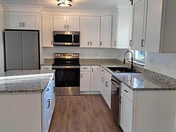 Move-in ready home on an oversized lot. This completely renovated house is ready for you to move in with just your personal belongings. The home features a newly installed roof and gutters to divert rainwater. Exterior Features: Freshly repainted exterior. Beautifully landscaped front yard. New concrete driveway leading to a carport. Fenced-in backyard, perfect for your "fur babies". Storage building for all of your outdoor tools. Interior Highlights: Step through your new front doors into an open-concept living, dining, and kitchen area. The updated kitchen includes a new stove, microwave, dishwasher, and sink. New, matching flooring and ceiling fans have been installed throughout the home. All windows feature stylish new Nero blinds. Updated Bathrooms: The guest bathroom has a new vanity, sink, toilet, and a new shower/tub on tiled floors. The master bathroom is a private retreat with a new toilet, sink, and vanity, plus a walk-in shower on a tile floor.