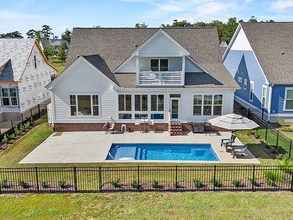 Inside, you'll find a dedicated office, spacious laundry room, a heated and cooled sunroom, and all-wood shelving throughout for a custom touch. The primary suite features a spa-like bath with a zero-entry tile walk-in shower and a generous walk-in closet. Upstairs, enjoy a covered balcony with Trex decking overlooking the private 12x25 pool and the community's 12-acre lake—perfect for relaxing with a view. The home also includes expansive walk-in attic storage above the garage that is wired with electric for a mini split if you would like to finish off the space for more heated square footage!