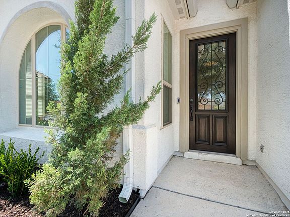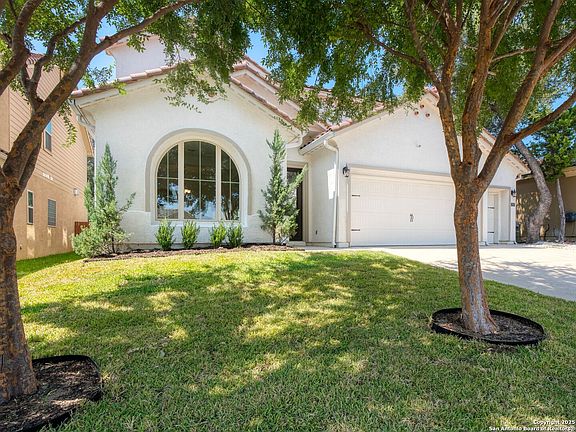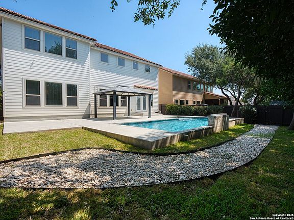 Located on a picturesque street in The Cliffs at Cibolo Canyons, this beautiful home showcases pride of ownership throughout. It features a rare private pool, soaring ceilings, an open layout, a tile roof, and a 3-car garage. The floor plan includes two living areas, a dedicated dining space, and the primary suite on the main level, with three additional bedrooms and a large game room upstairs. The kitchen is equipped with a granite island, stainless steel appliances, a gas cooktop, a built-in oven and microwave, custom maple cabinetry, and a butler's pantry. The primary suite features a tray ceiling with crown molding and a large walk-in closet, while the en-suite bath includes dual granite vanities, a garden tub, a separate walk-in shower, and tile flooring. The exterior is extremely well kept, offering mature trees, fresh sod, and landscaping in both the front and backyard, and a private pool that is ideal for relaxing or entertaining. This home provides convenient access to Stone Oak shopping, dining, and major thoroughfares, and is zoned to highly rated Johnson High School.