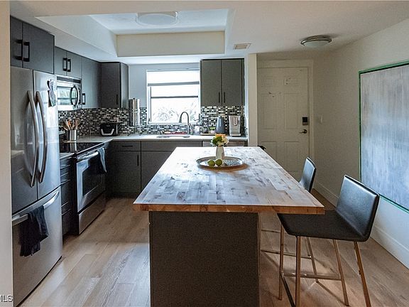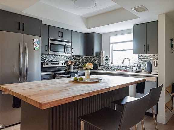 Renovated modern chic Waterfront Condo Available furnished or unfurnished. Move right in to this edgy, modern 2BR/2BA condo featuring open-concept living, in-unit laundry, and all furnishings optional. Modern kitchen with large island, newer appliances. Split floor plan with guest room and bathroom in front of condo. Primary suite with custom walk in closet, large en-suite bathroom and access to the lanai. Screened lanai with laundry closet, and open air balcony overlooking the peaceful water views. 1 Reserved parking spot and ample guest parking. Located in the gated community of Pine Haven, in the heart of Bonita Springs. Community pool and tennis. First and Security Deposit due at signing. HOA application and Fees required