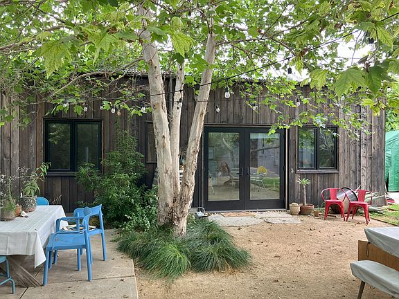 Modern plywood box with open floor plan, double height ceilings and storage loft. Built a few years back, the space has large openings and indoor outdoor living under the shade of three sycamore trees. It's a detached back house with lots of garden space to spread out and host dinner parties. Handcrafted details. Bathroom is split for easy multi-person use.