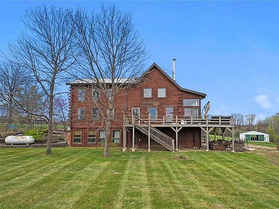 When you drive up on the maple lined driveway to this log cabin home situated on over 30 acres of rolling hill paradise you will feel like you have arrived to your forever sanctuary. Fruit trees, concord grape wine, wild life and flower beds are just a small part of what this sprawling property has to offer. Two story ceilings in the living room with charming wood stove, spacious country kitchen. Sunroom for all your plants and you to winter in and great deck that will fulfill every bird watcher's dream. HVAC is two years old, tankless water heater is installed and floors in the basement bathroom are heated. Five stall horse barn, large out building with concrete floor offer plenty of room for all your toys. Metal roof and gutters are brand new. Deer stands with wildlife cameras throughout the property will give you view into a beauty that this property offers. *All measurements, square footage, acreage, taxes and school information are approximate. Buyer agent please verify.*
