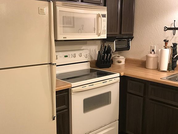 Amenities include full kitchen with fridge, electric range and oven, microwave oven, toaster oven, garbage disposal, dishwasher. Natural gas fireplace.