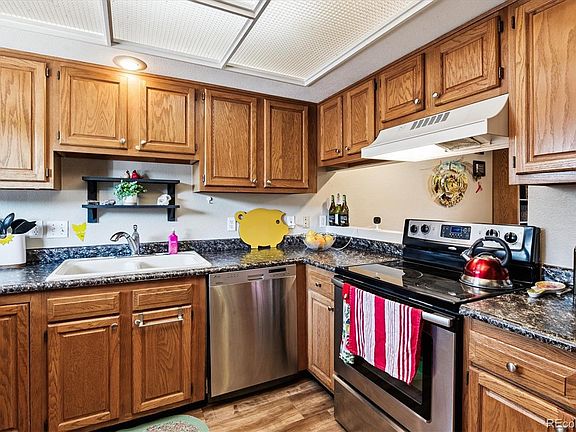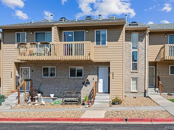 Beautiful townhome with walkout basement in quiet Aspen Meadows community. Home has 3 balconies, a covered patio, and a detached one-car garage. Bright kitchen with newer engineered wood flooring (2023), new dishwasher (2025), newer refrigerator (2023), and stainless steel appliances. Dining room with newer engineered wood flooring (2023). Cozy living room with gas fireplace, newer high-end carpet (2023), and built-in shelving. Plenty of natural light from the large sliding glass door that opens to a lovely balcony (8.5' x 6') overlooking grassy common space. Convenient half bath on the main level. Two spacious bedrooms upstairs, each with their own balcony and private entrance to the updated full bathroom. The master bedroom, with its vaulted ceiling and separate vanity space, provides a view of the common space and a glimpse of the Rock from the balcony. The second bedroom with its balcony looks over Memmen Ridge Open Space and has a small mountain view. Two skylights upstairs. The walkout basement offers a third bedroom with an attached full bath, closet, and new engineered hardwood (2024) opening to a covered patio (8.5' x 6'). Additional flex space/laundry room/storage with its own egress window. 6-panel doors. Home comes with a 14-month Blue Ribbon Home Warranty. Reserved parking spot (#282) and a 1-car garage (#17). The garage has attic space for storage with a pull-down ladder and enough room to stand up. Located in a quiet enclave surrounded on three sides by Memmen Ridge Open Space. Faces south -- light and bright. Close to Centennial Park and Burgess Pool, schools, shopping, and dining. Just a 15-minute walk to downtown Castle Rock via trail. Rare opportunity for a townhome with 3 bedrooms and a finished walkout basement in well-maintained Aspen Meadows.