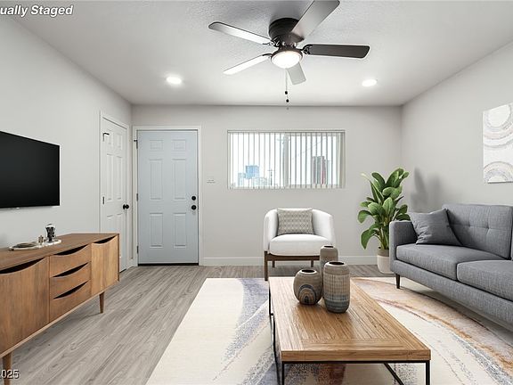 BEAUTIFULLY REMODELED HOME WITH FRONT PORCH VIEWS OF THE LAS VEGAS STRIP!!! Move in Ready! Modern style meets comfort in this multi-gen property in a desirable Las Vegas location. Conveniently close to schools, premier shopping, restaurants, major highways, and only minutes from the Strip. Its charm starts with a low-care landscape that features artificial turf. The interior exudes refined style with a neutral palette, recessed lighting & wood-look flooring throughout. Entertain with the seamlessly flowing open layout that is sure to impress! The updated kitchen boasts built-in appliances, quartz counters, a pantry, espresso cabinetry, and an island w/breakfast bar. The main house offers 3 beds & 2 baths! The primary bedroom includes a private bathroom for added ease. PLUS! You'll surely love the guest suite with a living room, bedroom, bathroom, & separate entrance. Let's not forget the large backyard, providing a covered patio & storage shed! What's not to like? Make this gem yours!